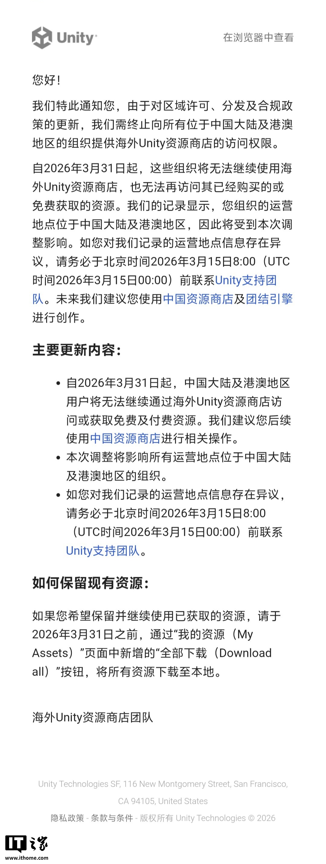 海外 Unity 资源商店将停止对中国大陆及港澳地区用户提供服务